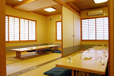 10人前後入れるお部屋が2部屋ご用意しております。仕切りを取ると最大24名様までご利用いただけます。会議、法事の後の一席、結納などの祝、送迎会などにもご利用ください。 |