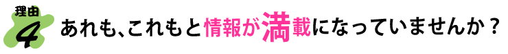 確かにスペースがあれば、「あれも入れたい」という気持ちもわかります。 しかし、情報が沢山あればあるほど、読者は自分にとって必要な情報があるのかどうかも気付かずに見落としやすくなってしましいます。何事もメリハリが必要ですね。